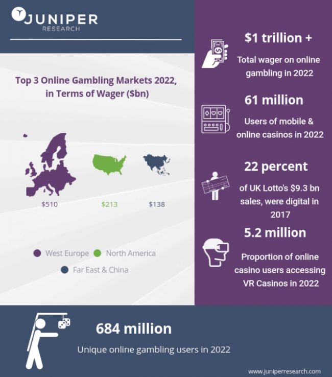 A pesquisa realizada pela Juniper mostrou que o maioria dos jogadores online estaria localizado em Europa Ocidental , com eles gerando apostas estimadas em cerca de R$ 510 bilhões de dólares até 2025. Platers online de América do Norte seriam os próximos da fila, com apostas de R$ 213 bilhões, enquanto os clientes do Extremo Oriente e China colocaria apostas online estimadas em pouco menos de R$ 140 bilhões até 2025.