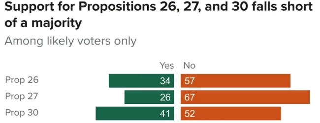 De acordo com uma pesquisa recente realizada pela Instituto de Políticas Públicas da Califórnia (PPIC) , a maioria dos candidatos do estado se opõe a ambas as propostas de apostas esportivas. O estudo que descobriu 57% dos concorrentes locais pretendem votar “NÃO” na Proposta 26 , enquanto 67% dos candidatos devem votar “NÃO” na Proposta 27 . Os dois projetos de lei de apostas esportivas devem receber um voto “SIM” de 34% e 26%, respectivamente. O PPIC descobriu ainda que cerca de 48% dos prováveis eleitores da Califórnia acreditam que apostas esportivas, em geral, seria uma coisa ruim .