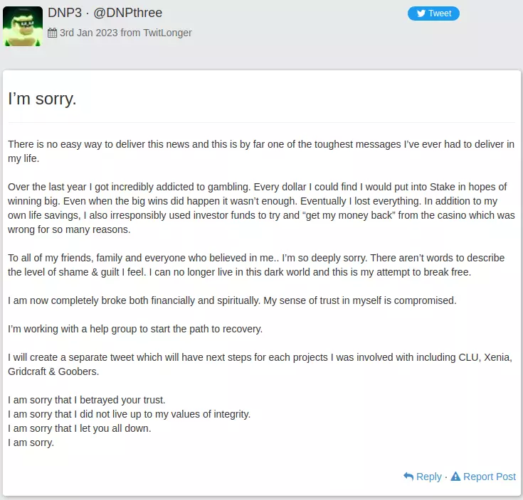 Como mencionado acima, em 3 de janeiro, DNP3 postou uma declaração no TwitLonger com a legenda “Sinto muito” explicando como ele tinha “perdeu tudo” para um vício em jogos de azar que se formou no ano passado depois que ele começou a transmitir a transmissão de jogos de azar patrocinados. O streamer explicou que costumava colocar “cada dólar” que encontrava em provedores de jogos de azar online, como o Stake, na esperança de obter uma grande vitória.